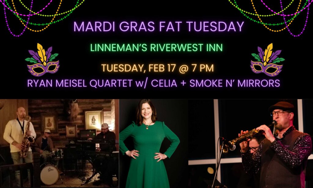 Celebrate Mardi Gras & Fat Tuesday!! Get into the spirit of the Mardi Gras as traditional New Orleans jazz is celebrated with the Ryan Meisel Quartet featuring Celia Meisel on vocals and sax!! Joining & opening for them is Smoke N’ Mirrors, a band that brings new life to the classic organ trio sound with original compositions and fresh improvisations. Come out to dance, celebrate the season and have fun. “Laissez les bons temps rouler!” Let the good times roll!