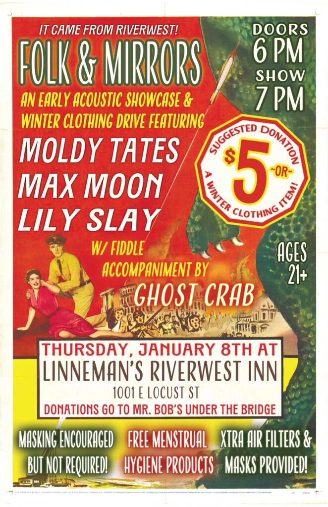 A Recent West Coast Transplant with a Rural Wisconsin upbringing, if You Mash Up Folk Punk & Y’allternative… You’d get a ‘Moldy Tates‘. Accompanied by ‘Ghostcrab’, who is Classically trained to Fan the Emotional Flames of every Song on the Fiddle.