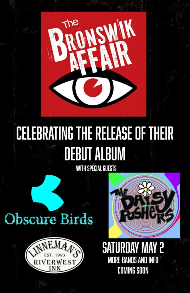 The Bronswik Affair is a Milwaukee quartet committed to creating an abundant future of fist-pumping rock n roll enjoyment. Ask your doctor, your mom, or your coolest friend if The Bronswik Affair is right for you.  The band features: