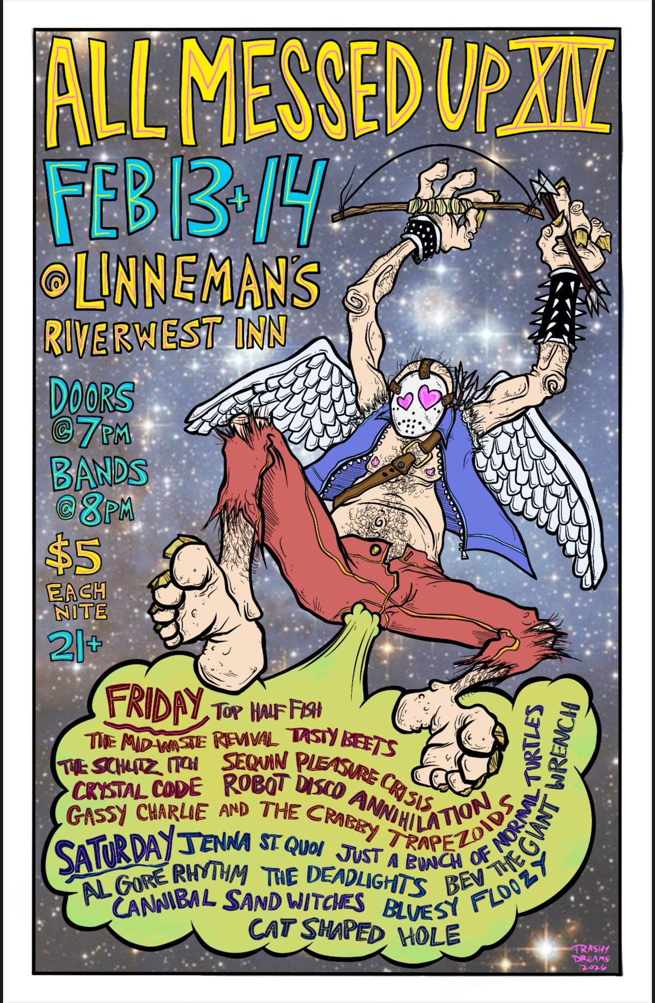 Maximiano Janairo, a Milwaukee-based singer-songwriter, has carved out a unique niche in the music scene with their soulful blend of heritage, identity, and raw human experience. Their debut album, "The Real Truth," explores themes of growth and change, with songs that shimmer, echo, and glide through tales of memory and identity. The album features a variety of sounds, including piano, pedal steel, flute, and clarinet, and is supported by an all-star band of Milwaukee musicians. Maximiano's music is described as lush, courageous, and ambitious, with a sound that captures the beauty of newfound wisdom. They are known for their willingness to write songs out of necessity, providing companionship for feelings that are too difficult or embarrassing to express. Maximiano's artistic journey has been shaped by their parents and their deep connection to their family's ancestry, and they embrace their identity as a mixed-race, non-binary, queer artist. Midwest independent folk fivesome with moody dark country and traditional celtic influences. Queer. Bitch Creek’s first single “Animal” is out now on Bandcamp and all streaming platforms. Marble Teeth, the solo project of Caleb Jefson, is an indie artist from Decatur, Illinois, known for his rock and folk music. His music often reflects his personal experiences and influences, showcasing a unique blend of indie and folk sounds. Caleb's approach to music production is unique, as he handles all aspects of his music, including playing, recording, mixing, and album covers, often using a mix of DIY and professional methods. His brand, Marble Teeth, is characterized by its handmade merchandise, including custom shirts and branded items. Doors at 6:30pm, Music at 7:00pm, $10 individual / $15 Couple